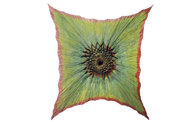 The treatment that Luis Matías Santos applies to the paper, from the inside of the fibers, with the use of methyl cellulose and resins, results in an incredibly resistant material. The geometric structure and the wrinkles and folds give the paper characteristics that it does not possess, such as flexibility, allowing opening and deformation movements that lead to multiple mounting possibilities. The pearlescent effect of the finishes, mixed with the colors of the pieces and the geometric structure, provokes organic movements and infinite shapes, evoking different worlds: animal, vegetable, mineral, aquatic, dreamlike, geometric…