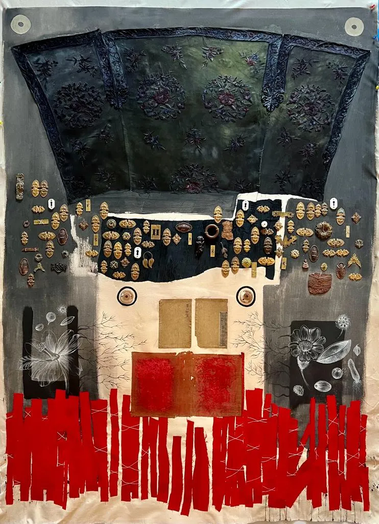 Collage, ensamblaje, pintura, dibujo y costura sobre lienzo /